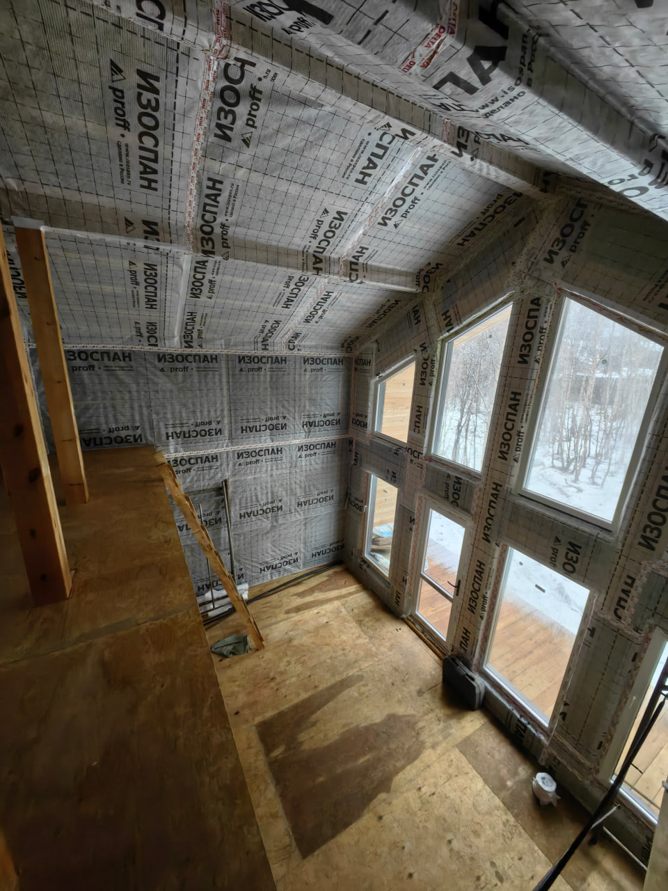 Черновая подшивка потолка из ОСП 9мм. Пароизоляция Изоспан RS Proff. Утепление 250 мм эковата.